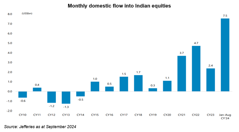 India, derimot, har allerede en veletablert aksjeeierkultur, som står for 6 prosent av husholdningenes eiendeler sammenlignet med 5 prosent i Kina og 12 prosent i eurosonen. Selv om sammenligningen med mer utviklede land antyder at det er stort potensial for økt aksjeeierskap, har endringen i India også vært svært rask. Før den nylige aksjeoppgangen allokerte den gjennomsnittlige indiske husholdningen bare 1 prosent av sin økte sparing til aksjer i regnskapsårene 2014–2017, ifølge Jefferies. Innen 2024 har dette tallet steget til 7 prosent noe som antyder en betydelig endring i appetitten for aksjeinvesteringer.