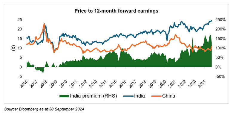 Men som verdibaserte og kontrære investorer er vi alltid bevisste på prisen som betales relativt til verdien vi kan forvente å motta i fremtiden. Og her er bildet mindre klart. På enkle mål som pris i forhold til inntjening, handles MSCI India for tiden på sitt høyeste nivå relativt til 12-måneders forventet inntjening, mens MSCI Kina handles nær sitt laveste punkt de siste ti årene. India handles ikke bare til en betydelig premie i forhold til sin egen historie, det er også høyt verdsatt sammenlignet med andre markeder globalt, og er derfor en klar avviker når det gjelder prisen investorer er villige til å betale for fremtidig inntjening.