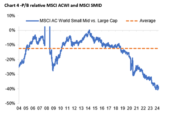 • På P/B-basis fortsetter rabatten for globale småselskaper mot store selskaper å øke: