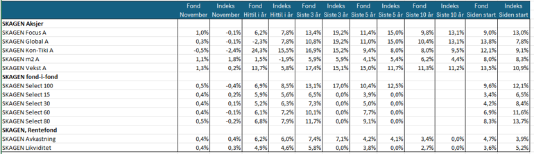 SKAGEN Focus slo indeksen i november, og oppnådde 1 prosent avkastning, mens indeksen falt 0,1 prosent.  Små‑ og mellomstore selskaper overgikk mega‑caps, samtidig som presset og den høye prisingen i enkelte AI‑relaterte navn ble mer tydelig.