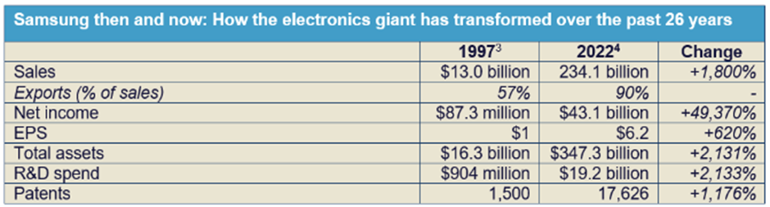 -I 1997 opplevde Sør-Korea økonomiske utfordringer - høye renter og lav vekst - noe som førte til at Den internasjonale valutafond (IMF) måtte bistå dem. Heldigvis var Samsung allerede en global virksomhet på dette tidspunktet, så størsteparten av salget kom fra eksport og deres ni utenlandske forsknings- og utviklingssentre.