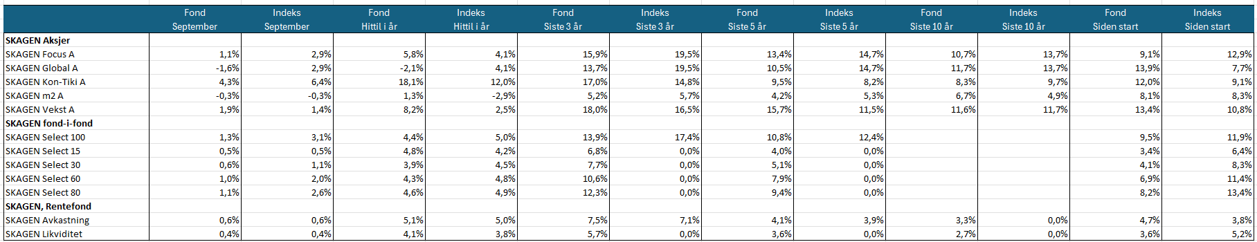 Etter et sterkt første halvår underpresterte fondet i tredje kvartal. SKAGEN Global falt 2,7 prosent tilbake mens indeksen steg 6,1 prosent i kvartalet. Se flere avkastningstall nederst i artikkelen.