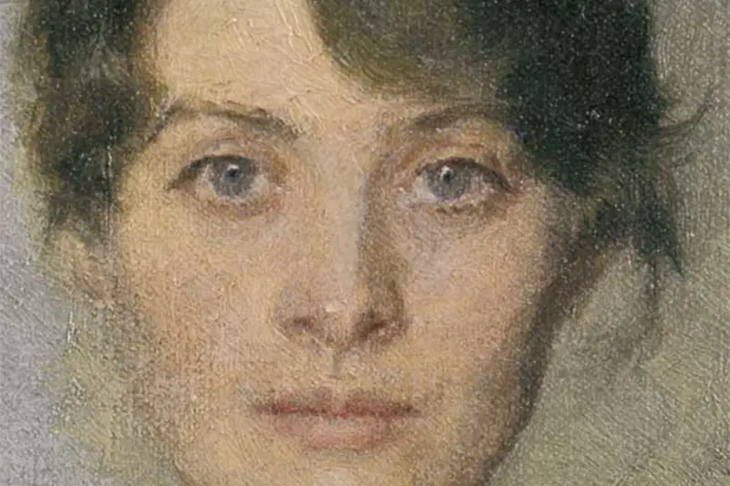 Skagenmålning som föreställer en kvinna med blå ögon och mörkt hår i närbild.