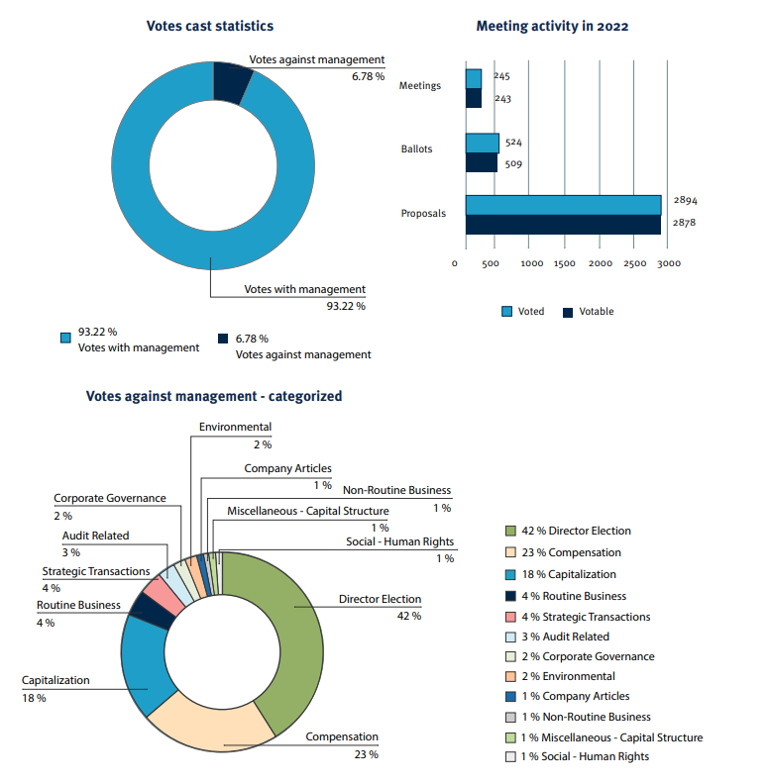 Despite the fact that there was less activity engaging directly with companies in 2022, SKAGEN was able to maintain our voting activity at Annual General Meetings and Extraordinary General Meetings. In 2022, there were 245 voteable meetings and 524 voteable ballots in the portfolio companies with 2,894 voteable items on the agenda. SKAGEN voted on 99.45% of the items and against management on 6.78% of all voted items.